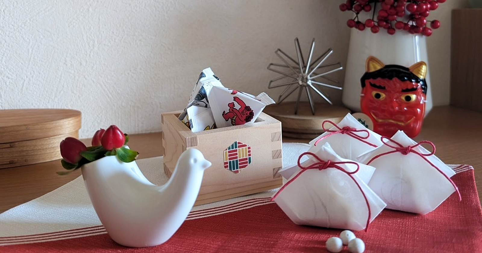 恵方巻きや豆まきのお写真、節分にまつわるアイテムやちょっと可愛い鬼のディスプレイなど、