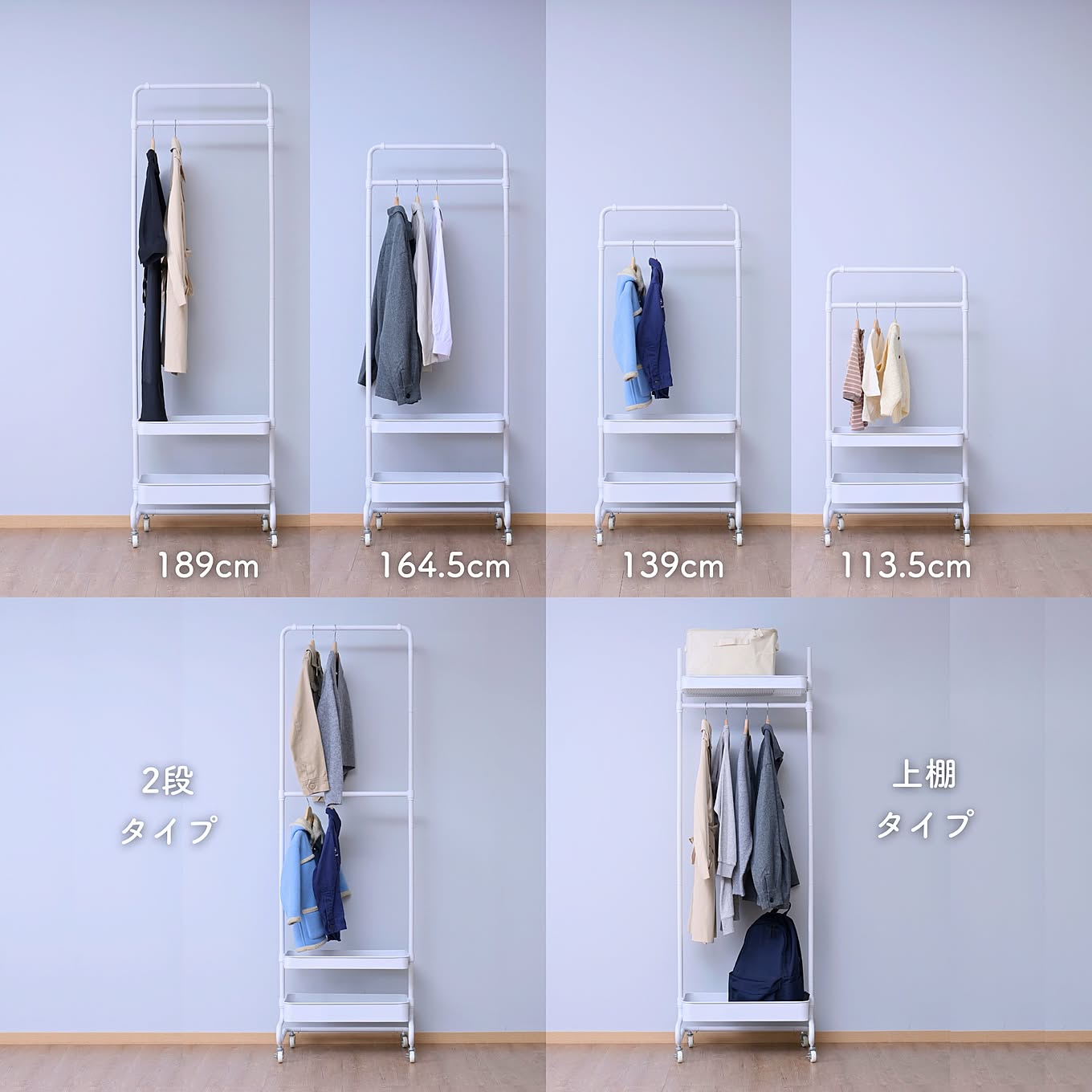 ハンガーを掛けるパイプは、ワンピースやコートも掛けられる高さから、お子さまでも使いやすい高さまで調節可能。バスケットも2.5cm間隔で細かく高さが変えられるため、しまう物のサイズに合わせて自由にカスタマイズできます。