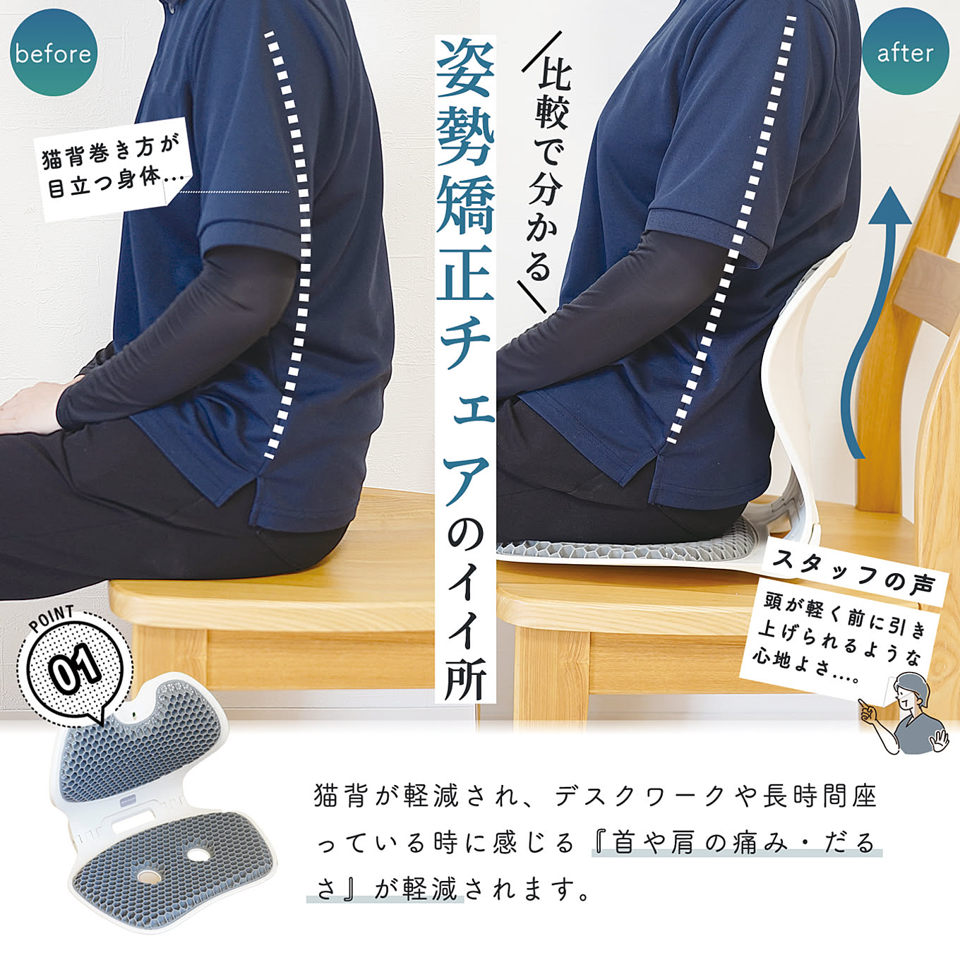 肩が開き、胸が自然に前へ出ることで、呼吸がラクになり、疲れにくい体に導きます。硬すぎず、柔らかすぎない絶妙な弾力で、お尻や腰にかかる圧を分散。座っている間も安定感があり、体が左右に傾きにくく、無意識のうちに姿勢が整っていきます。