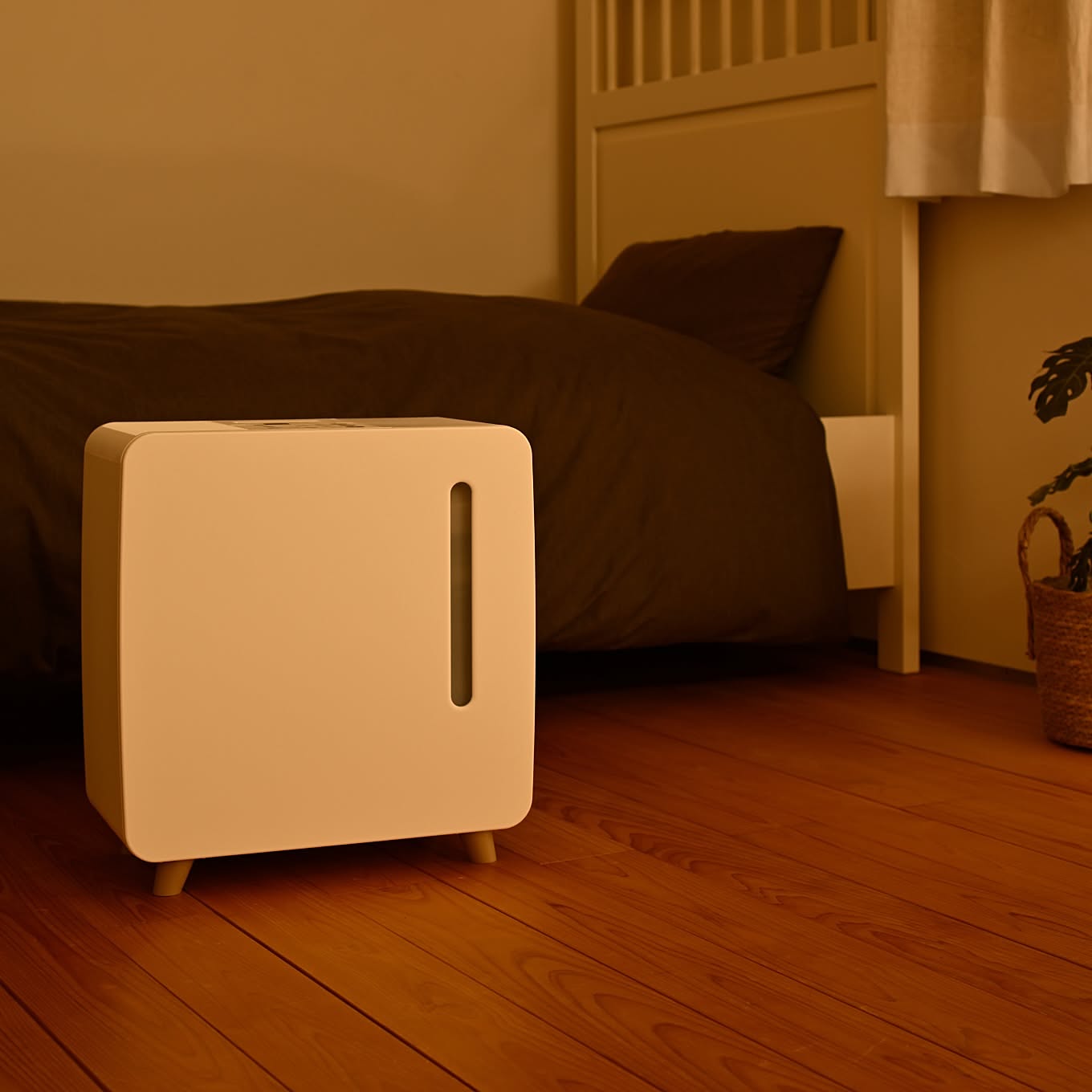 丸みを帯びたフォルム&ブラウンの脚がちょこんと飛び出す家具調デザインで、寝室でも使いやすいサイズの加湿器です。業界トップクラス※の静音性で、癒しの空間をじゃましません。