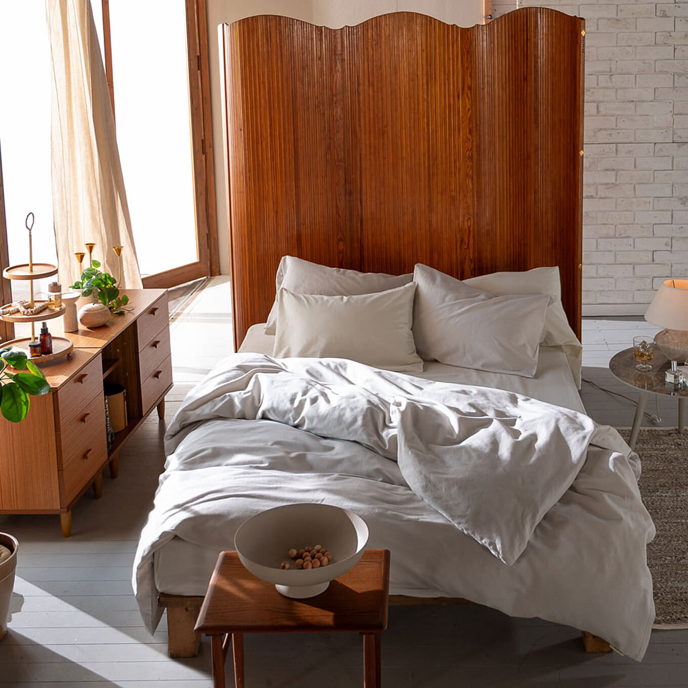 暖冬傾向にある気候のなかでも、比較的長くお使いいただけるような、そしてベッドリネンとしてはあまり流通していない素材を使用いたしました。