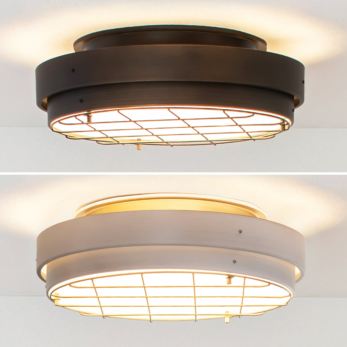 重なり合う2層のシェードと、印象的なメッシュカバーに重厚なアイアン素材を使用し、塗装には素材感を引き立てる繊細なヘアライン塗装を採用。