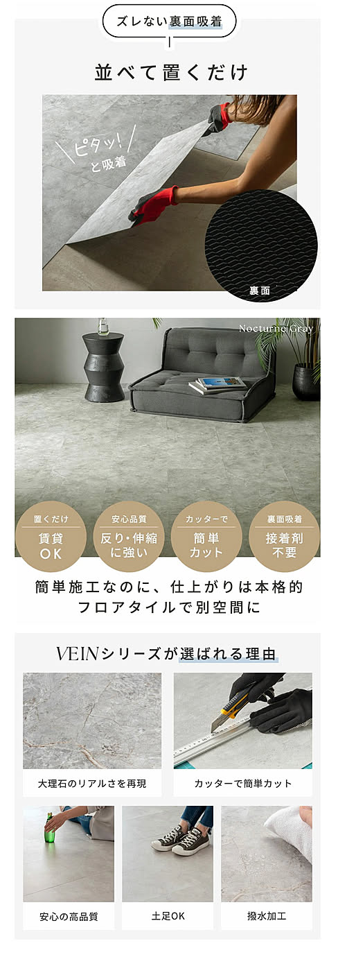細やかなエンボス加工とリアルなプリントにより、まるで本物の天然石のような上質な質感を再現した、置くだけフロアタイル「VEIN(ベイン)」シリーズ。