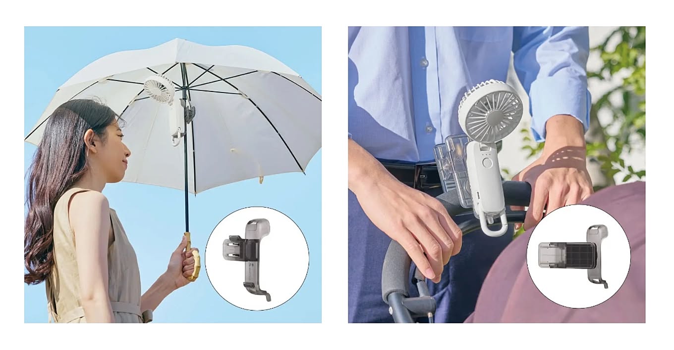 さらに、日傘に取り付けて手ぶらで涼める「日傘クリップ」や、お好みの場所に固定できる「マルチクリップ」もセットになっているので、シーンに合わせて自由な使い方が楽しめます。