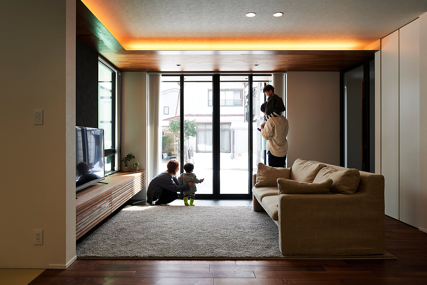 植物を育てられる庭を作りたいとの事で、土間のあるプランをご提案。 玄関ホールの段差を少なくするなど、外とのつながりを感じられるよう工夫しました。 玄関からファミリークロークを通して水回りやキッチンに直接行くことができる配置にしました。 床はブラックウォールナット、土間上部の天井はチークを使用しています。 畳スペースの壁に外と同じ外壁を使用し、外とのつながりを感じられるようになっています。