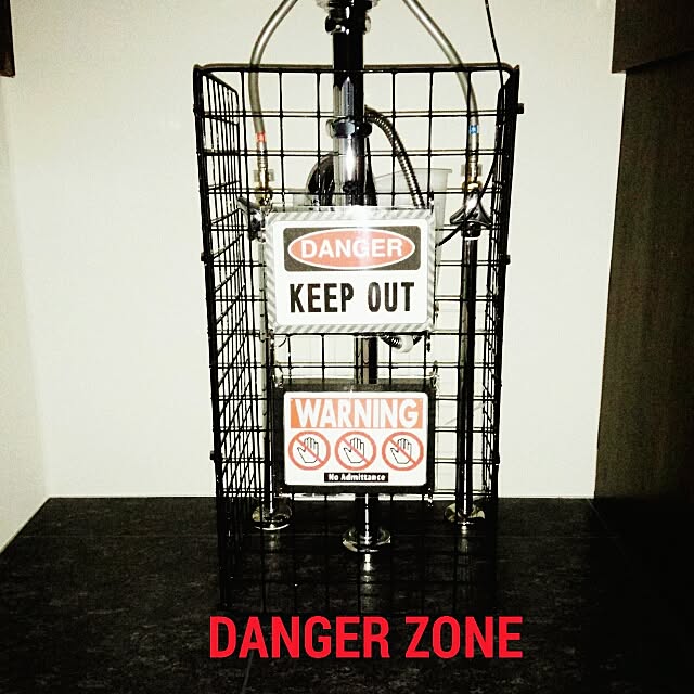 配管にワイヤーネットでベビーガードを作成されています。DANGERの標識が遊び心があっていいですね。立派な男前インテリアになっています。自作だからこそ配管にぴったりサイズのベビーガードになっていますね。