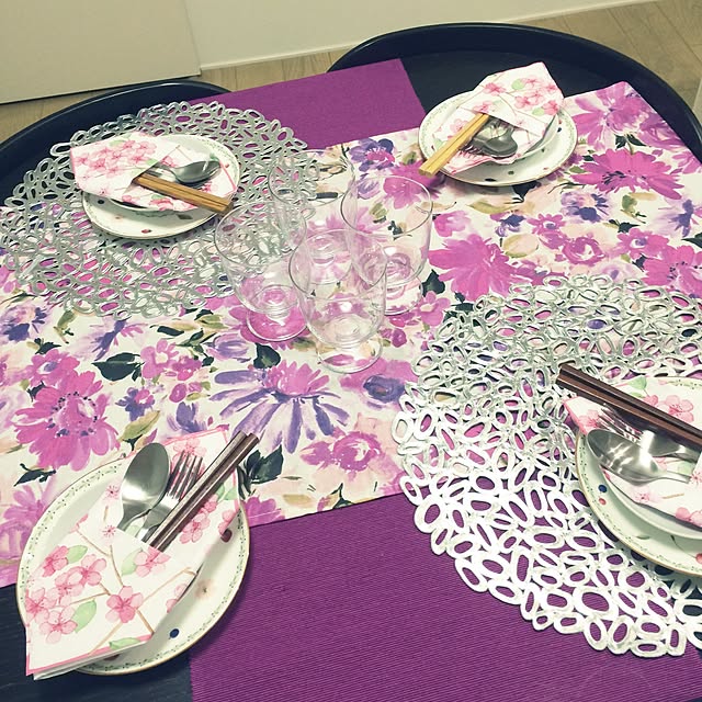 鮮やかな配色が、水彩画のようなテーブルランナーに、桜柄のナプキンを合わせた、maruさんのテーブルコーディネート。春の生命の力強さを感じるような色使いが、とっても素敵です。ナプキンなど布や紙物は、インテリアに取り入れやすいアイテムですね。