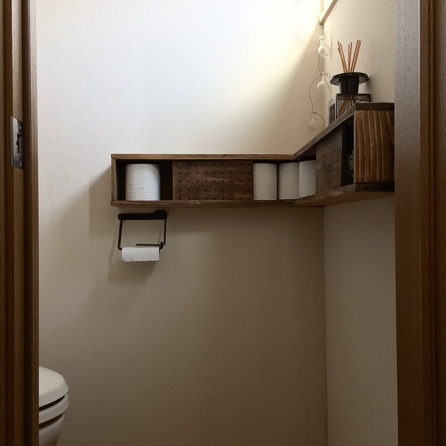 トイレットペーパーがぴったりと収まる細長いDIY棚。有孔ボード部分はスライドし、お客様の目に付いて欲しくないものなどをカバーできるようになっているそう。必要なものを置く、程よく隠す、気負わず快適に暮らす…そんな目的や願いをシンプルに果たすtomowithdogさんのDIYと空間づくり、そして、そこに住まうご家族に「グッドデザイン!」を送りたくなりました。