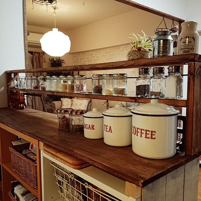 DIYのキッチンカウンターの棚にキャニスターを並べて、さりげなく目隠し。ガラスとホーローのキャニスターは、どちら側から見てもいい眺めですね。