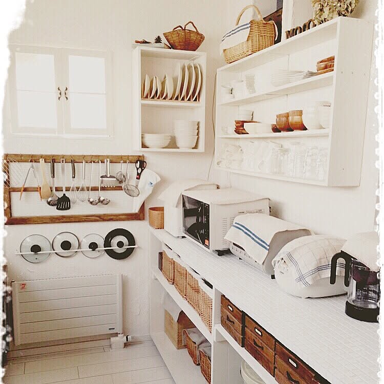 こちらもタオルハンガーを鍋蓋収納に利用しています。4つも並べられるので、かなり広めの幅でしょう。上には古い窓枠を利用し、キッチンツールがたっぷり吊るされています。ステキな見せる収納は、作業効率も上がりそうですね。