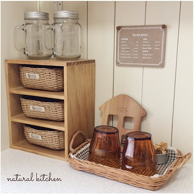 整然と並べられた、カップやドリンキングジャーも無垢材とあわせれば、あたたかみが出ますね。ドリンキングジャーなど同じものをいくつか並べて置くだけで、簡単にカフェ風のインテリアを作ることができますよ。