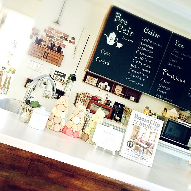 「元々はカップボードもキッチンパネルも全部真っ白の木目調のものでした。温かみのあるキッチンにしたい、黒板塗料も使用してみたい!と考えていたので、いっそのことカフェ風にしようと思い今の形になりました!」