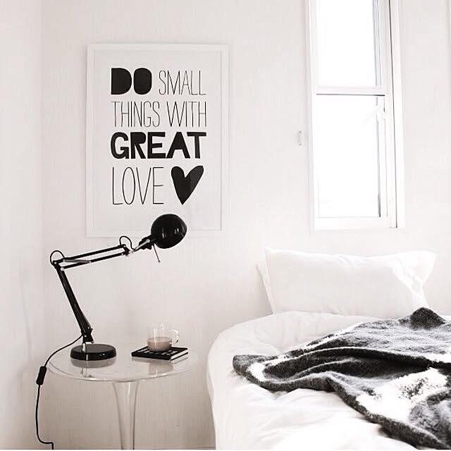 モノトーンでまとめられたベッドルーム。ベッドリネンを白にすることで、とても清潔感のあるベッドルームになります。アクセントの黒が引き締めカラーになっています。