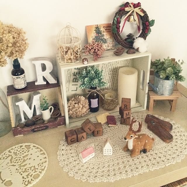素敵な木製のABC積み木がクロシェレースにぴったりですね。白い壁に茶色の小瓶、ペンキがはげたような木のシェルフ、あたたかみのある小物......そしてレース。カフェの雰囲気がいっぱいつまった空間です!