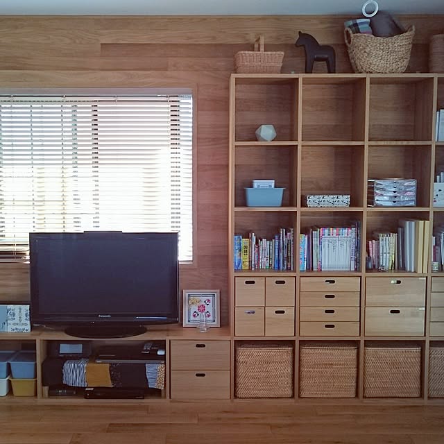 スタッキングシェルフのオーク材と、壁や床がまるで一続きになったような、木のぬくもりあふれるすてきなリビング。横1列ごとに同じ収納スタイルにそろえることで、とてもスッキリとした印象に感じます。
