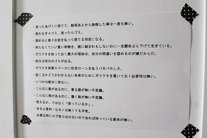 「お気に入りの物を飾りながらも、スッキリと掃除のしやすい暮らしが理想です。そのため、物を買う時はよく考え、不要な物は手放す様に心掛けています。 ネットで見つけた『捨てたくなる名言 』を目に付く収納扉の内側に貼り、日頃からその意識を忘れないようにしています。」