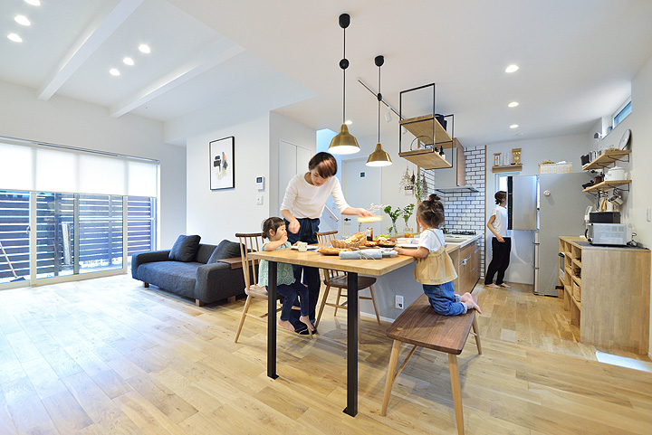 「少し顔を出すと、1階フロアをほぼ見渡せる開放感あるキッチンが我が家の中心となっています。 キッチンとダイニングテーブルを一体化することによりスッキリさせ、あえて余白ある空間を作ることで開放感を実現しました。」