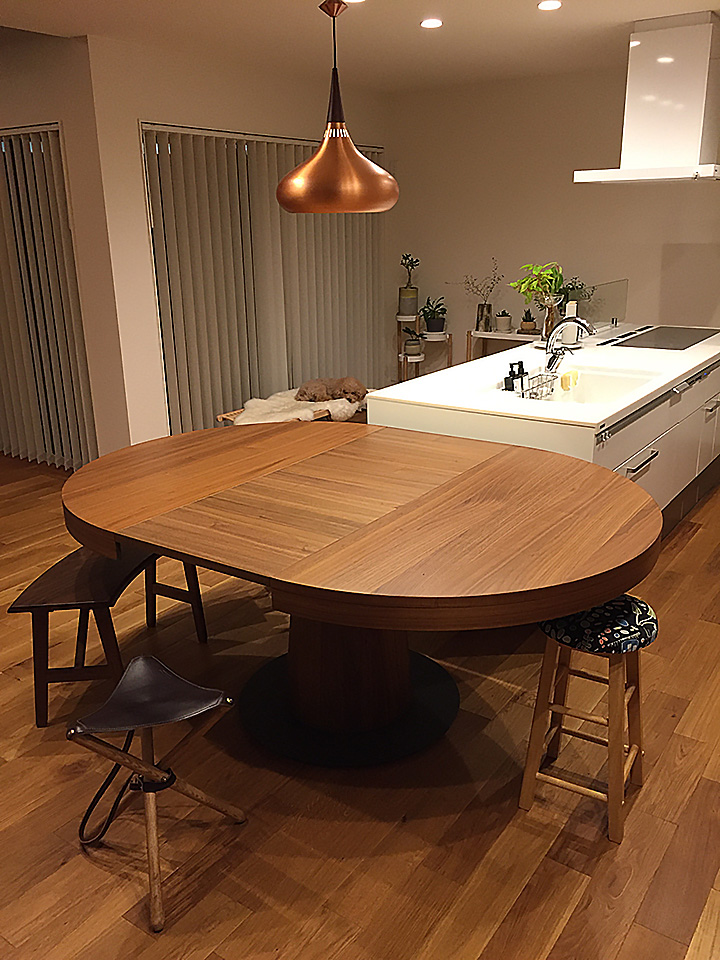 「色々な人に順序が違うと言われましたが(笑) うちの場合、ダイニングテーブルを一番最初に購入し、それを中心にキッチンの形やカラーを決めています。そして最後に、ダイニングテーブルと同じ材質のベンチやカップボードを合わせたんです。 ダイニングテーブルは、家具のなかでも大きく存在感のあるものなので特に拘りました。主役を決めて、それに合わせて空間をコーディネートしていくことで、全体に繋がりや統一感がうまれ落ち着いた雰囲気に仕上げられると思います。」