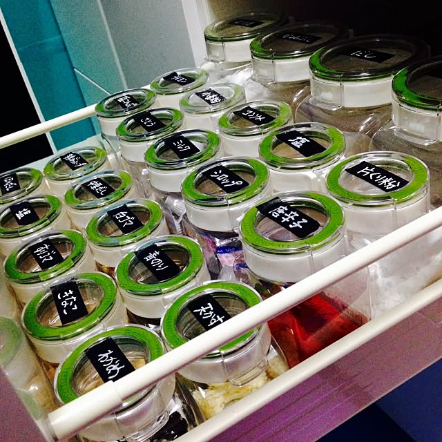 キッチンの引き出しにフレッシュロックで収納しています。調味料だけでなく、乾物や粉ものも。ひとめで何がどこにあるかわかるので、つい袋のまましまって使い忘れるなんてこともありませんね。
