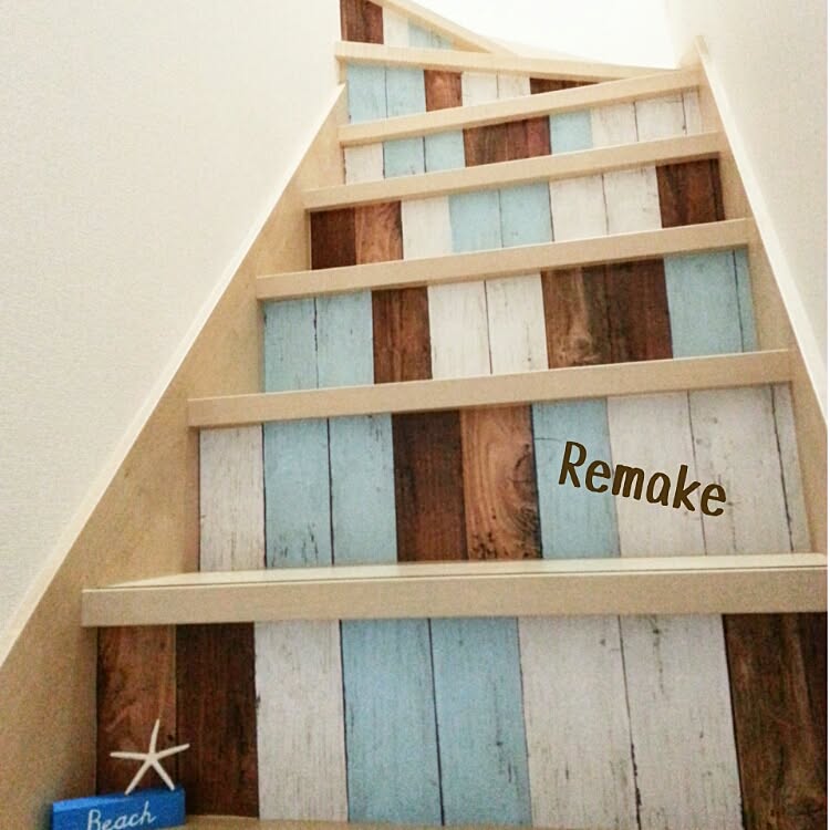 こちらの、西海岸風テイストを思わせる木材柄の階段DIY。実はダイソーのインテリアシートのもの。カラーの違う3色のインテリアシートを組み合わされています。お店の階段みたいですよね。端に飾られたスターフィッシュが、よりいっそう西海岸テイストを引き立ててくれています。