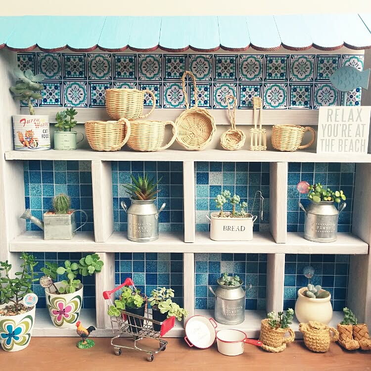 ミニチュアのプランターに多肉を1種類ずつ入れています。籐で編まれたキッチンツールはmasumixさんのハンドメイド。DIYで作ったおうち型シェルフの中はにぎやかです。