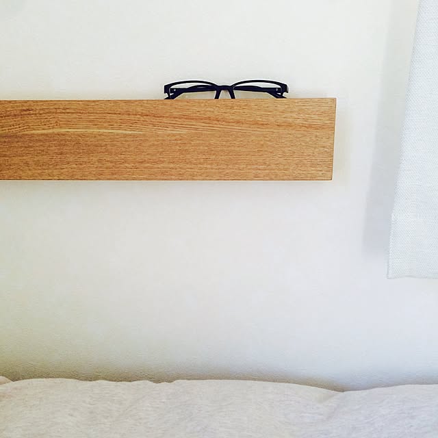 無印良品の、壁に付けられる家具を設置し、眼鏡を収納されています。本や絵などを立て掛ける家具なので、幅が狭く、眼鏡を立てて置くことができます。寝転がっていても手が届く位置にあると、とても便利ですね。