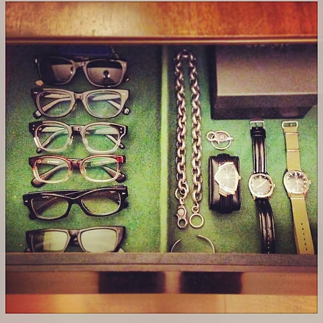 引き出しの中で、眼鏡の部屋とアクセサリーの部屋が分かれているので、コーディネートがしやすい収納方法です。フェルトが貼ってあるので、眼鏡に傷がつきにくく、高級感も出ます。おしゃれが好きなユーザーさんにピッタリの収納ですね。