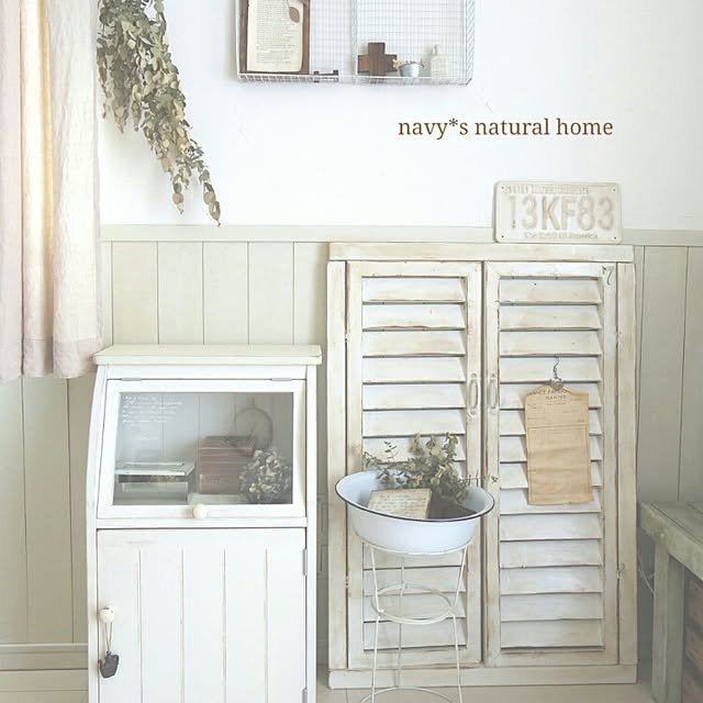 ナチュラルでシャビーなインテリアのお部屋のユーザーさん。100均アイテムをリメイクして、ウォッシュボールスタンドを作っています。グリーンを入れたホーローのウォッシュボールが、外国のおうちのようですね。