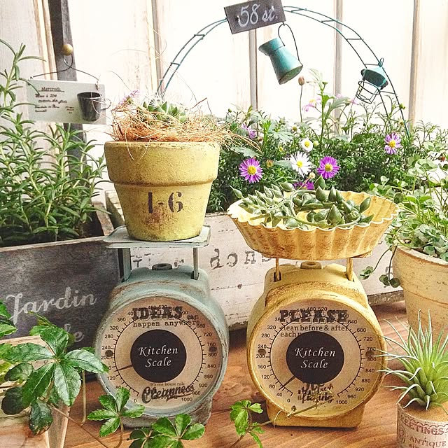 グリーンと相性の良い量りアイテム。そんな量りアイテムに転写シールを貼ることで、もっとグリーンに馴染むガーデニングインテリアになります。ナチュラルなグリーンと合わせるからこそ、転写シールでオリジナル感をだしてみましょう。