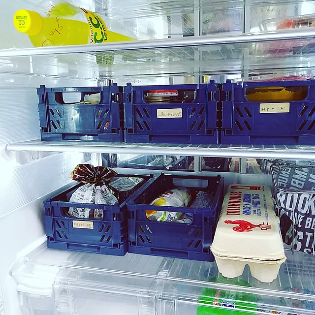 鮮やかなブルーのコンテナボックスをそろえて、冷蔵庫内の整頓に使う新鮮なアイデア!取り出しやすいコンテナボックスは見た目にも美しく、庫内がキリリと引き締まりますね。冷蔵庫の中まで、アメリカンカジュアルな雰囲気が漂います。