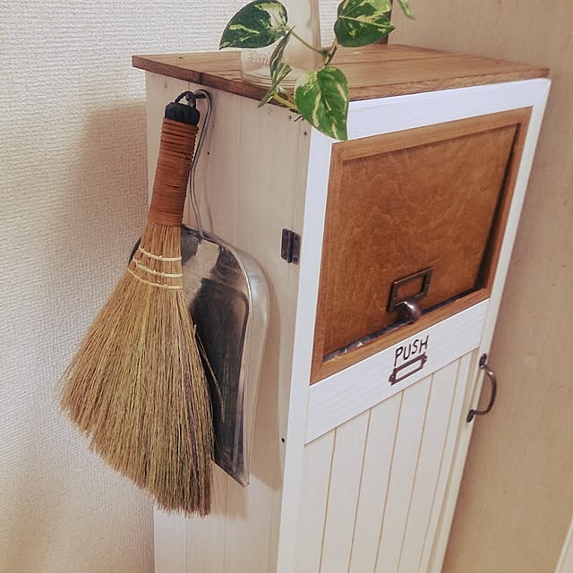 白×ベージュがナチュラルな雰囲気がかわいいDIYダストボックスです。パタパタ扉がついているので中身が見えないのにサッと捨てられて使いやすそうですね。ちりとりとほうきを引っ掛けたりアレンジできるのもDIYのいいところですね。