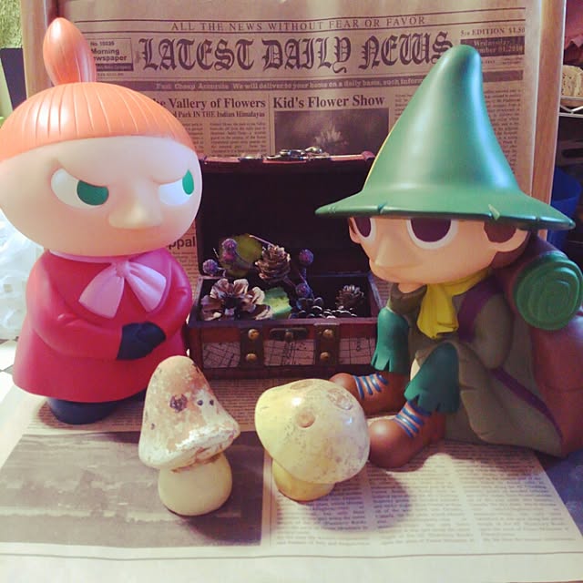 ムーミンのソフビ貯金箱です。こちらのユーザーさんのように、ムーミンとフローレンをふたり並べると、仲むつまじい姿にほっこり癒やされます。北欧柄のテーブルクロスに、ぴったりですね。