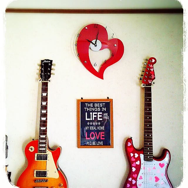 アシンメトリーな赤いハートがポップなニトリの「掛け時計(シャンブルハート)」は、デザイン重視で秒針がありません。素材はポリスチレンです。ハートの掛け時計は、ギターの壁面ディスプレイともピッタリですね。