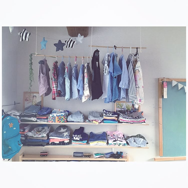 子供の洋服だから、大人の洋服よりカラフルなものが多いです!見せる収納で洋服をたたみ、重ねておくだけで、そのカラフルさが素敵なインテリアとなりますね。