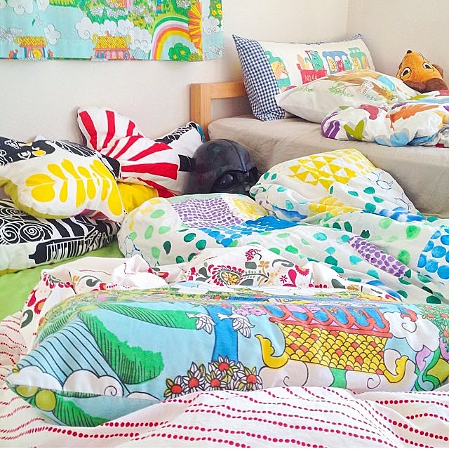 寝転がる時間を心待ちしてしまいそうな、カラフルなファブリックで覆われたベッド。マリメッコをはじめとする、ヴィンテージの布のレトロでキッチュな柄とあたたかな色合いが魅力的です。無地の布団カバーにお気に入りのファブリックをポイントとして縫い付けてもいいですね。
