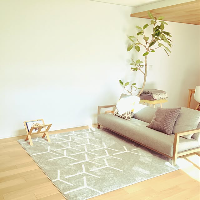 北欧スタイルのすっきりとしたお部屋です。高さがなく低めのソファに、シンプルなデザインのカーペットを敷かれています。ソファの手すり部分と同じ素材のブックスタンドが、ポイントになっています。ソファ後ろの大きなゴムの木にも癒されますね。