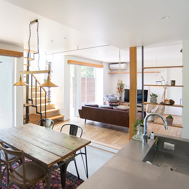 ダイニングを土間にすることで、リビングとの繋がりを保ったまま、空間をゆるく仕切れるというメリットも。ナチュラルな中にも土間のエッジが効いた、オシャレなリビング&ダイニングです。土間にアンティーク風のダイニングテーブルは鉄板です。