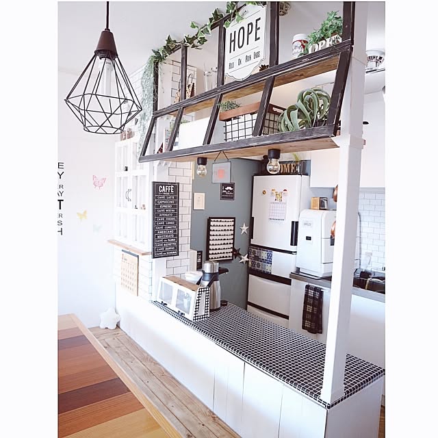 カフェのレジ前のようなキッチンカウンター。黒く塗られて、天井から下げられた内窓風の窓枠がアクセントになっています。サブウェイタイル風の壁紙や天板の黒タイルシート、メニューボードなど、カフェよりもカフェらしいインテリアに仕上がっています。