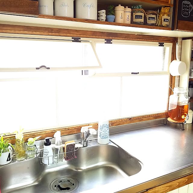 ナチュラルなキッチンに、DIYした窓枠が。写真左手のドアと同じリーフグリーンが、みずみずしさと初々しさを感じさせ、ナチュラルなインテリアになじんでいます。上部の凝った格子窓が欄間のようにデコラティブで、感度の高さが印象に残ります。