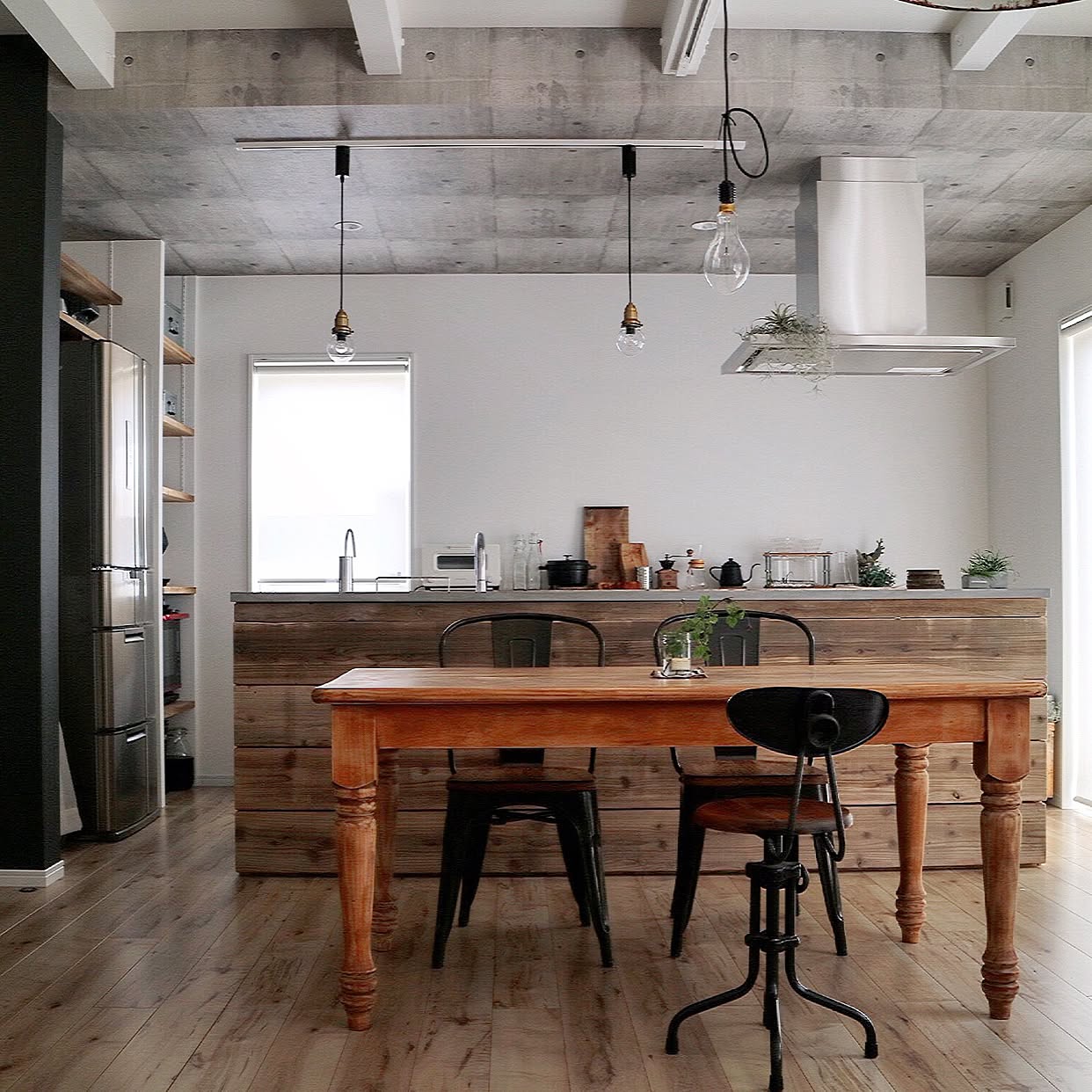 banbiさんは、キッチンカウンターに足場板を貼り、天板はコンクリート風にペイント。ゴツゴツとした手触りを感じさせる、インダストリアルなダイニングキッチンです。アイアンのチェアがよく似合いますね。