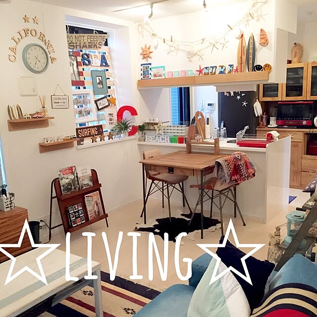 窓や壁、カウンター上などお部屋全体をサーフテイストでまとめられたリビングです。サーフボードのモチーフやヒトデのガーランドがにぎやかで、元気な気持ちになれそうですね。色とりどりのディスプレイのある空間を、シンプルなダイニングセットやマガジンラックが引き締めています。