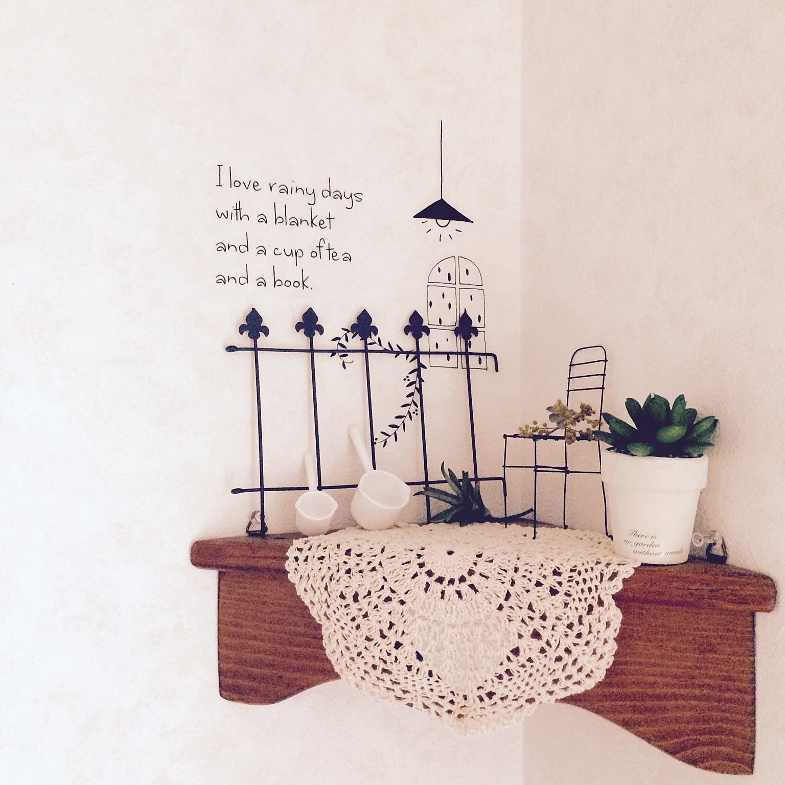 コーナーに合わせた三角棚。木目も美しくて色目もきれいです。レース編みを掛けた上には、百合門にミルクパンを立てかけ、針金アートの椅子にミモザのドライフラワーをのせました。壁に貼ったウォールステッカーは、レターと雨の降る窓、ライト。細部まで整っていて、魅せられます。