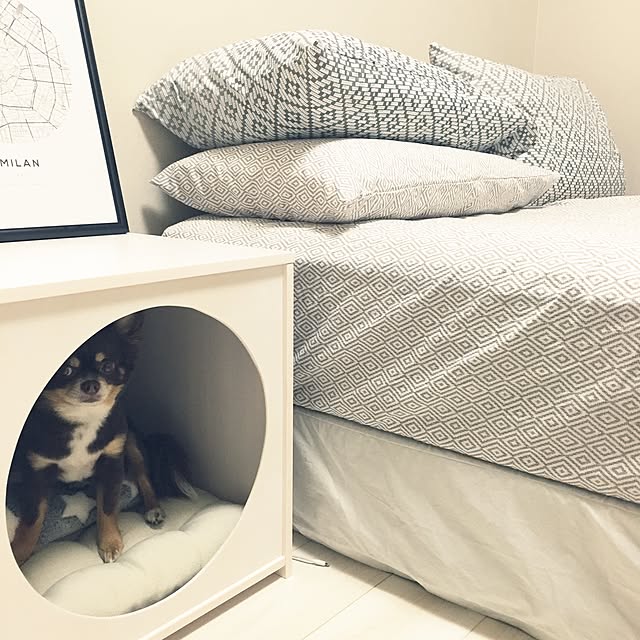 もちろんアイコンだけではありません。それぞれの空間にすっと、愛犬の居場所が馴染んでいるのも特徴的です。こちらはM.H.Lさんご夫婦の寝室。北欧テキスタイルでスタイリッシュに仕上げられたベッドの横には、まるでサイドテーブルのようにモダンなペットハウスがあります。リビングのティーピーも、ダイニングの一画に置かれたクッションも、きちんとインテリアの一部として絵になっていました。人も犬もシンプルにモダンに、そして何より快適に暮らすために丁寧にこだわるのがM.H.Lさん流の住まいづくりなのですね。