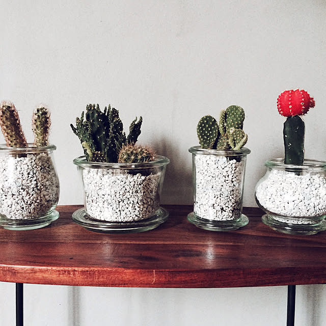 WECKの瓶に植えられたミニサボテンたち。形が違うサボテンを、それぞれ違う形の瓶に植えることで、並べて置いたときに面白味が出ていますね。ガラスを使うことで、軽やかさが出ているので、家の中のどこに飾ってもインテリアになじみそうです。