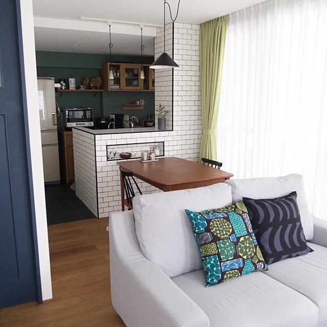 ブルーのソファが印象的なリビングのユーザーさんです。IKEAの特徴あるデザインのクッションを効果的に取り入れて、一気に北欧テイストのお部屋に変身させていますね。シンプルなお部屋ならではの、コーディネートテクニックです。
