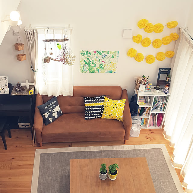naeさんはリビングの吹き抜けから、こちらの写真を撮影されたそうです。アクセントカラーを黄色に決めて、インテリアアイテムをそろえられたとか。黄色の花柄が印象的なマリメッコのクッションカバーは、ご自身で手作りされたものだそうです。癒し系のクッションで快適な時間がすごせそうですね。