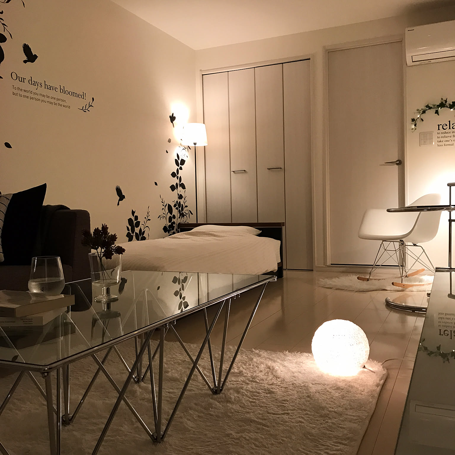「カフェのテラスや公園など、屋外で自然の景色を見ながら食事をしたりするのが好きなので、草原や公園にいるような癒し空間をテーマにしました。 ただ、自然のテーマと言っても茶系のものは控えて、大好きな透明感のあるシンプルな色合いで統一してます。 また、部屋が一つだけなので、昼夜で違う雰囲気を楽しめるようにしています。」