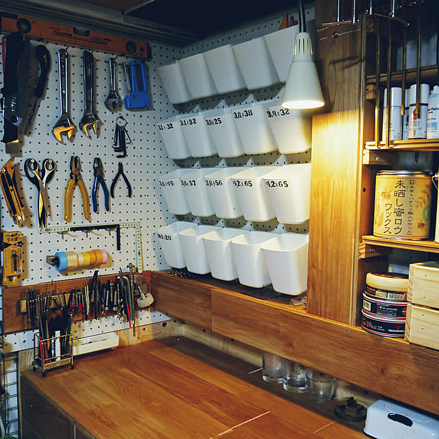 作業中もすぐにものを手に取りたいなら、壁面収納をするのがオススメ。ワンアクションで出したりしまったりができるので、効率も良さそうです。ずらりとそろった小物入れで、統一感も抜群。落ち着く雰囲気です。