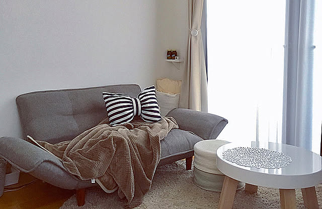 「ほんのり甘めでやさしい雰囲気のお部屋にしたいので、ホワイトをメインにグレーと温かみのあるベージュでまとめるようにしてます。物があってもすっきり見えるよう工夫をしてます。 木目調の収納や家具は増えるとナチュラル感が強いお部屋になってしまうので、取り入れすぎないように気をつけてます。」