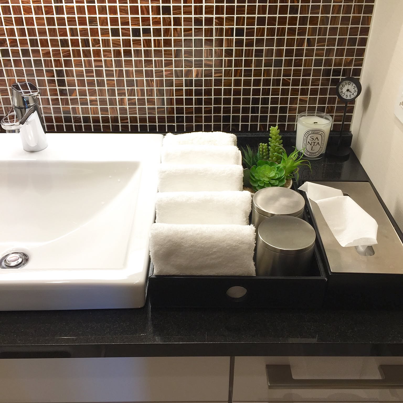 ホテルスタイルなインテリアでは、限りのあるスペースを美しく見せるための工夫がいろいろあります。見せる収納もその1つ。小さなお子さんがいる legomamaさんは、手をふくタオルを次々取り換えるスタイルを採用。トレイに並べておくと、見た目も美しいですね。黒とシルバー、白といった色づかいもシックです。